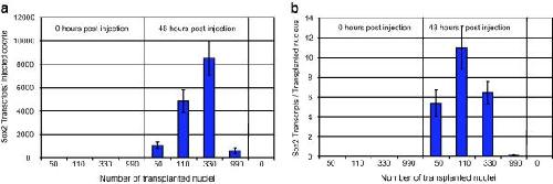 Fig. 5. Reprogramming signal strength and efficiency are optimal between 100 and 300 nuclei. Transcription of Sox2 from different numbers of C2C12 nuclei injected into Xenopus oocytes and maintained at 16 °C for 48 h (a). Efficiency (absolute number of transcripts/transplanted nucleus) of Sox2 reactivation from different numbers of C2C12 nuclei injected into Xenopus oocytes and cultured at 16 °C for 48 h (b). P < 0.02, error bars are mean SD.