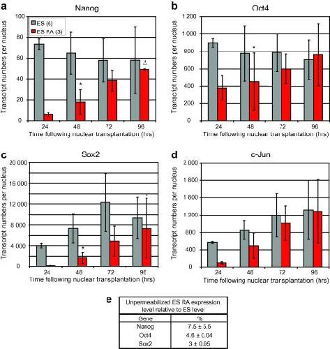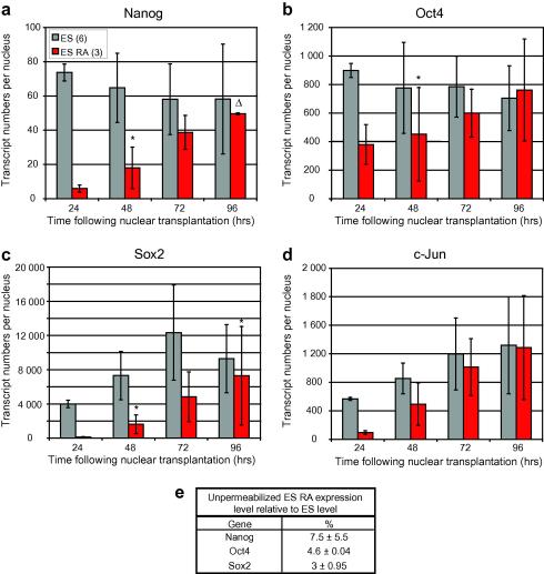 Fig. 9. Expression of Nanog (a), Oct4 (b), Sox2 (c) and c-Jun (d) from oocytes injected with either ES or retinoic acid differentiated ES (ESRA) nuclei (see key). (e) Transcript values for Nanog, Oct4 and Sox2 in wholes ESRA cells as compared to whole ES cells prior to permeabilization. This illustrates the typical differences between ES and 4 day retinoic acid-treated ESRA cells. Error bars represent standard deviation of mean biological replicates (n is indicated in brackets for each cell-type in the key). Δ indicates one or more replicate discarded due to GV mis-targetting for that sample group. P < 0.5, unless marked ∗0.1 > P > 0.05 or ∗∗P > 0.1.