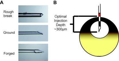 Fig. 2. Typical needles used by members of our group (A). The ‘rough’ breaks are achieved by ‘nipping’ the needle tip with forceps. The needle can then be further sharpened by grinding or pulling on a micro forge, to give the ‘ground’ or ‘forged’ needle tips. GV targeting can be enhanced by marking the needles at 150–250 μm and 350–450 μm giving target depth marks on the needle shaft. (B) Diagram showing needle position of ‘minimum’ (black) and ‘maximum’ (red) depth marks on a needle in relation to a correctly targeted GV.