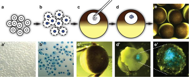 Fig. 3. Nuclear transfer to Xenopus oocyte GVs. Cultured cells (a) are harvested, washed and permeabilised with SLO. Successful cytoplasmic membrane permeabilisation is detected by incorporation of Trypan Blue and cytoplasmic expansion (b, b′), whereas unpermeabilised cells do not incorporate the dye (a′). SLO permeabilised cells are directly transferred into the GV of stage V and VI Xenopus oocytes (c). Oocytes are held at a 45° angle using forceps, and nuclei are transferred directly by inserting the glass nuclear transfer pipette into the centre of the animal pole of the oocyte, until it is judged to have reached the inner part of the GV (c′). Oocytes are incubated in MBS medium, supplemented with 0.1% BSA, at 16–18 °C following transplantation (e). Successful targeting to the GV is revealed after oocyte dissection and Hoechst staining (in blue, d′). (e′) It shows an isolated GV containing injected nuclei stained with Hoechst (blue).