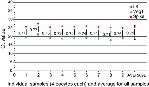 Fig. 7. Real Time PCR Ct values for L8, VegT and an RNA “spike” gene for nine samples of four oocytes each. Numbers adjacent to bars indicate the ratio of the ‘spike’ Ct to mean L8 and VegT Ct values.