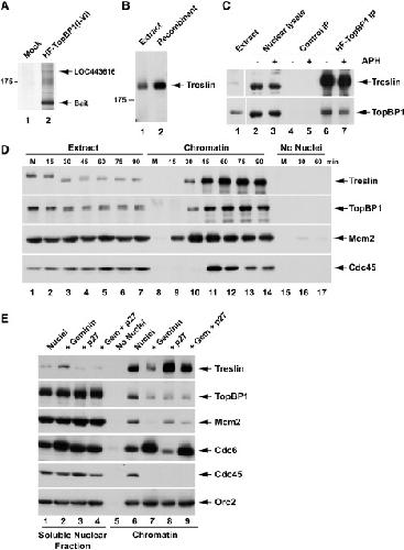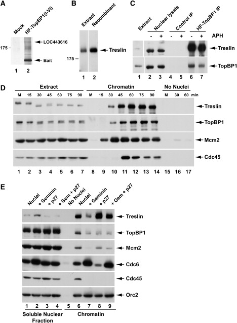 Figure 1. Identification of Treslin as a TopBP1-Interacting Protein in Xenopus Egg Extracts (A) Nuclear lysates were incubated without (lane 1) or with HF-TopBP1(I-VI) (lane 2) in the presence of anti-FLAG antibody beads. Beads were retrieved and processed for silver staining. (B) Interphase egg extract (lane 1) and recombinant Xenopus Treslin from insect cells (lane 2) were immunoblotted with anti-Xenopus Treslin antibodies. Lanes are aligned from the same gel. (C) Nuclear lysates from egg extracts lacking (lanes 2, 4, and 6) or containing aphidicolin (APH) (lanes 3, 5, and 7) were incubated with anti-FLAG beads containing no recombinant protein (lanes 4 and 5) or full-length HF-TopBP1 (lanes 6 and 7). Beads were reisolated and immunoblotted for Treslin and TopBP1. Lane 1 shows an aliquot of initial egg extract. (D) M phase extracts (M) from unactivated eggs were left unactivated (lanes 1, 8, and 15) or activated with calcium (lanes 2â7, 9â14, 16, and 17). Extracts were incubated with (lanes 1â14) or without sperm nuclei (lanes 15â17). Chromatin fractions from activated extracts were isolated at the indicated times. Chromatin from M phase extracts was incubated for 30 min (lanes 8 and 15). Mock chromatin fractions were isolated from extracts lacking sperm nuclei (lanes 15â17) at the indicated times. Samples were immunoblotted for the indicated proteins. (E) Egg extracts were incubated in the presence (lanes 1â4 and 6â9) or absence of sperm nuclei (lane 5) with no inhibitor (lanes 1, 5, and 6), geminin (lanes 2 and 7), p27 (lanes 3 and 8), or both geminin and p27 (lanes 4 and 9). Soluble nuclear fractions (lanes 1â4) and chromatin fractions (lanes 5â9) were immunoblotted for the indicated proteins. See also Table S1. |
