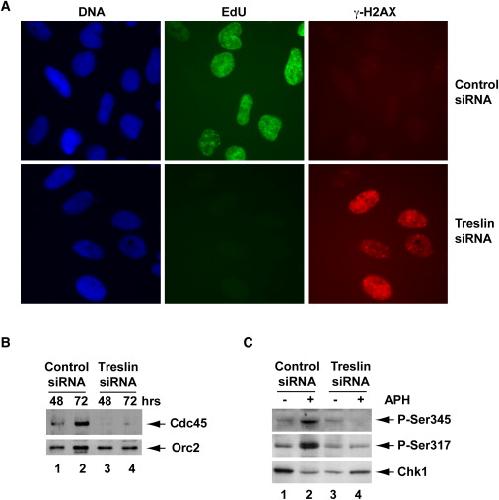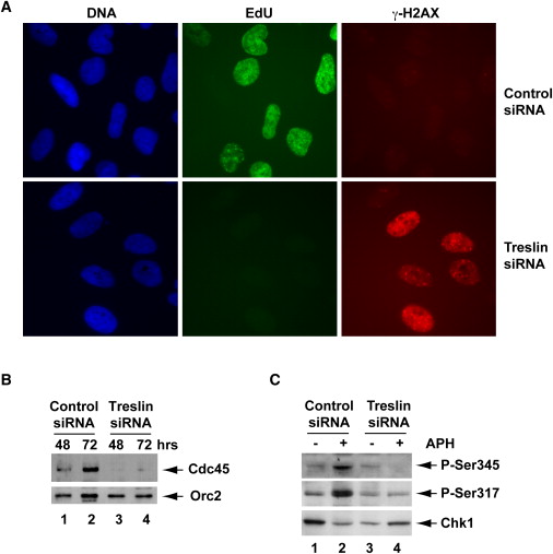 Figure 6. Treslin-Depleted Cells Defective for DNA Replication Also Accumulate Damaged DNA (A) Cells treated with control siRNA or Treslin siRNA #1 for 72 hr were stained with Hoechst dye to detect DNA, Click-iT reagent to detect incorporated EdU, and antibodies against γ-H2AX. (B) Chromatin fractions were prepared at 48 and 72 hr from U2OS cells transfected with control siRNA (lanes 1 and 2) or Treslin siRNA #1 (lanes 3 and 4). Fractions were immunoblotted for Cdc45 (top) and Orc2 (bottom). (C) Control (lanes 1 and 2) and Treslin siRNA-treated cultures (lanes 3 and 4) were incubated for 15 min in the absence (lanes 1 and 3) or presence of 10 μg/ml aphidicolin (lanes 2 and 4). Cultures were processed for immunoblotting with antibodies that detect Chk1 or phosphorylation of Chk1 on Ser345 or Ser317. See also Figure S5. |
