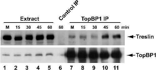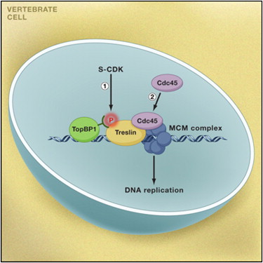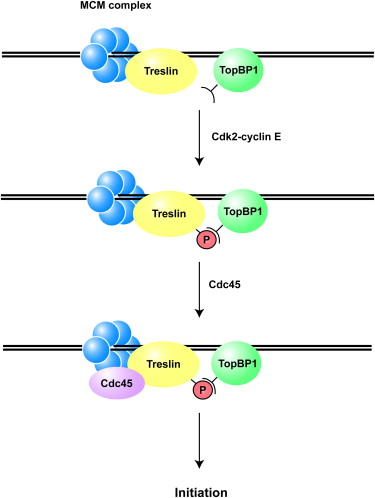 Treslin collaborates with TopBP1 in triggering the initiation of DNA replication.