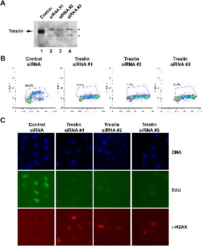 Figure S4. Multiple Treslin siRNAs Elicit a Similar Inhibition of DNA Replication in Human CellsâRelated to Figure 5 (A) Lysates from U2OS cells treated with control siRNA and the indicated Treslin siRNAs for 72 hr were immunoblotted for Treslin. Asterisks denote cross-reacting bands. (B) U2OS cells treated with the indicated siRNAs for 72 hr were labeled with EdU for 1 hr and stained with the Click-iT EdU flow cytometry staining kit. DNA was stained with 7-AAD. The y axis indicates fluorescence intensity, and the x axis indicates DNA content. (C) U2OS cells were treated with the indicated siRNAs for 72 hr and labeled with EdU for 1 hr. Cells were fixed and processed for detection of DNA (top), EdU (middle), or γ-H2AX (bottom). |