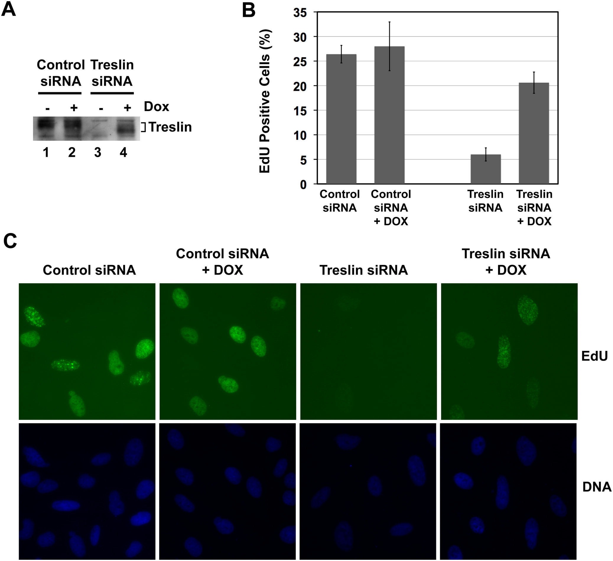 Figure S5. Rescue of DNA Replication in Treslin-Ablated Cells with Recombinant Treslin—Related to Figure 6 (A) U2OS T-REx cells capable of expressing an siRNA-resistant form of Treslin in a doxycycline-inducible manner were incubated for 24 hr in the absence (lanes 1 and 3) or presence of doxycycline (DOX) (lanes 2 and 4). The cells were then transfected with control siRNA (lanes 1 and 2) or Treslin siRNA #1 (lanes 3 and 4). After an additional 72 hr, cell lysates were prepared and immunoblotted for Treslin. (B) Quantitation of the percentage of cells incorporating EdU under the indicated conditions. Values were obtained from three independent experiments (mean ± standard deviation). (C) The indicated cultures were processed for visualization of incorporated EdU (top) or total DNA (bottom). |