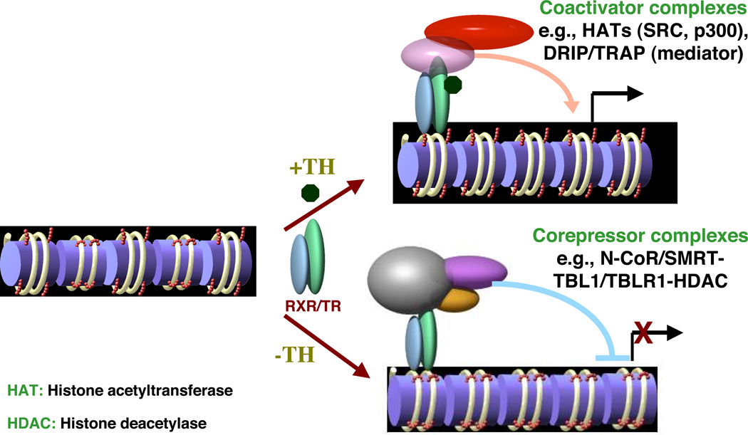 Fig. 1. Mechanisms of transcriptional regulation by TR. For TH-inducible genes, TR heterodimerized with RXR constitutively binds the TREs in their promoters or enhancers. In the absence of TH, TR binds corepressor complexes, such as those containing histone deacetylase HDAC3 and the highly related protein N-CoR or SMRT to inhibit transcription from the promoters. This is accomplished in part through deacetylation of lysine residues of histone H3 and H4 to induce a “closed” chromatin state, as suggested by the folding of histone tails (red beaded structure) on to the DNA helix, because of the charge-charge interaction between the positively charged histone tails and negatively charged DNA. The binding by TH induces a conformational change in TR, leading to the binding of coactivator complexes, such as those containing coactivators SRC and p300, which are histone acetyltransferases (HATs). They will acetylate histones H3 and H4, facilitating the formation of an “open” chromatin state, as diagramed by the unfolding of histone tails (red beaded structure) away from the DNA helix due to the neutralization of the positive charges on the histone tails by acetylation. Liganded TR can also recruit other coactivator complexes, such as chromatin remodeling complexes and mediator complex (also known as DRIP/TRAP complex), with the latter directly contacting RNA polymerase, to activate transcription.