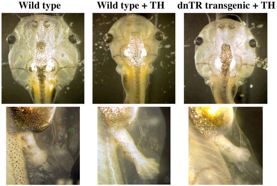 Fig. 3. TR is necessary for the metamorphic effects of TH. Transgenic expression of a dominant negative TR (dnTR) blocks TH-induced metamorphosis. Wild type animals treated with TH underwent characteristic changes, including gill resorption and limb morphogenesis (compared the middle panels to the ones on the left). The TH-treatment failed to induce such changes in the sibling transgenic animals (right panels, which resemble the left but not the middle ones) (Buchholz et al., 2003).