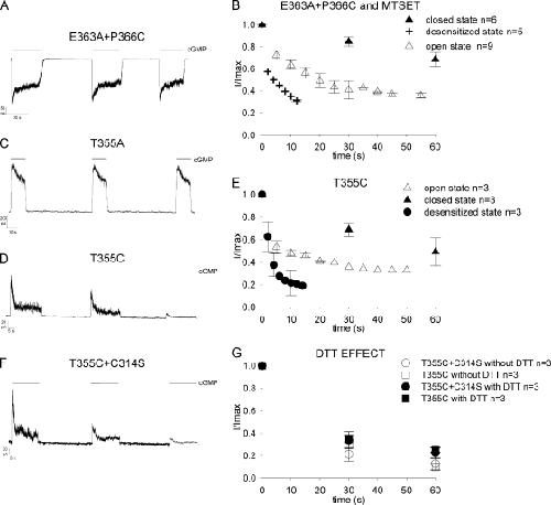 Figure 3. Desensitization in mutant channels E363A+P366C, T355A, T355C, and T355C+C314S. cGMP-activated current traces in the desensitized state of four mutant channels: E363A+P366C (A) at −60 mV, T355A (C), T355C (D), and T355C+C314S (F) at +60 mV. 1 mM cGMP was added as indicated by the solid horizontal black bars. (B) State-dependent modification in closed (solid triangle), open (open triangle), and desensitized (plus) states of mutant channel E363A+P366C in the presence of 2.5 mM MTSET. The plot shows the state-dependent modification calculated from the amplitude of the peak current (I) every 30 s in the closed state and 5 s in the open state, whereas in the desensitized state the values of current were measured from the peak (I) to the steady state (I) every 2 s. The values were normalized (I/Imax) to the peak current of control (Imax) at time zero. (E) State-dependent modification in closed (solid triangle), open (open triangle), and desensitized (solid circle) states for mutant channel T355C in the absence of 2.5 mM MTSET. The values of current were measured as in B. (G) Comparison of mutant channels T355C and T355C+C314S in desensitizing state in the absence (black open circle and square) and in the presence (black solid circle and square) of 5 mM DTT applied to bath solution. Symbols represent the amplitude of the peak current (I) measured every 30 s for both mutant channels and normalized (I/Imax) to peak current of control (Imax) at time zero. |