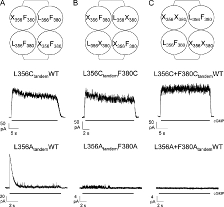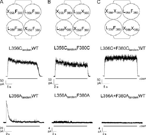 Figure 5. The interaction between L356 and F380 is within the same subunit. Diagrams representing subunit composition of the tandem L356XtandemWT (A, top row), the tandem L356XtandemF380X (B, top row), and the tandem L356X+F380XtandemWT (C, top row) in which X = C or A. Each subunit is represented by a circle, whereas the linker of 10 amino acids between two subunits of the tandem is represented by an arc (see Materials and methods). In the middle row, cGMP-activated currents in the presence of 1 mM cGMP at +60 mV in the tandem L356CtandemWT (A, middle row), in the tandem L356CtandemF380C (B, middle row), and in the tandem L356C+F380CtandemWT (C, middle row). In the bottom row, cGMP-activated currents in the presence of 1 mM cGMP at +60 mV in the tandem L356AtandemWT (A, bottom row), in the tandem L356AtandemF380A (B, bottom row), and in the tandem L356A+F380AtandemWT (C, bottom row). |