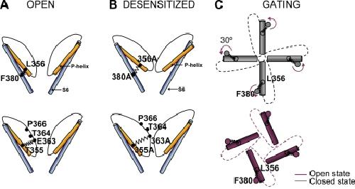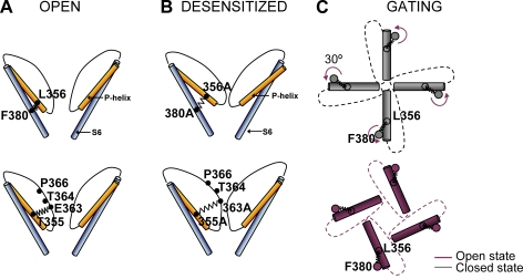 Figure 6. Illustrated representations of hypothesized molecular interactions between S6 and P helix during gating. (A) In the open (and closed) states of the WT CNGA1 channel, the hydrophobic interaction between Phe380 and Leu356 couples S6 and the P helix, and a presumed H-bond between Thr355 and Glu363 couples the P helix and the pore wall. (B) In mutant channels E363A, T355A, L356A, and F380A, these interactions are lost and, after opening, mutant channels desensitize. In mutant channel E363A, residues in positions 364 and 366 become more accessible to the reagents added to the extracellular medium. (C) A simplified model of gating in CNGA1 channels: in the closed state (gray) the tip of P helices occludes the pore lumen; during gating, the S6 helix rotates by 30° anticlockwise, the pore is not occluded (red), and ions can permeate through it. The hydrophobic interaction between Phe380 and Leu356 couples the rotation of S6 to the motion of the P helix. |