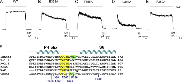 Figure 1. Desensitized mutant channels. cGMP-activated currents in the presence of 1 mM cGMP at +60 mV in the WT (A) and mutant channels E363A (B), T355A (C), L356A (D), and F380A (E). cGMP was added as indicated by the solid horizontal black bars. (F) Sequence alignment between CNGA1, Shaker, Kv1.2, Kv2.1, KcsA, and NaK channels. The TVGYG signature of K+ channels is highlighted in yellow. Amino acids that become more accessible upon desensitization or C-type inactivation are highlighted in green. The sequence alignment was performed by using Clustal W (Thompson et al., 1994). |