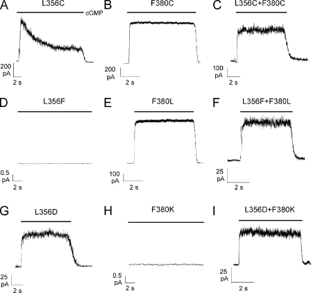 Figure 4. Recovery from desensitization in double-mutant channels. cGMP-activated currents in the presence of 1 mM cGMP at +60 mV in mutant channels L356C (A), F380C (B), L356C+F380C (C), L356F (D), F380L (E), L356F+F380L (F), L356D (G), F380K (H), and L356D+F380K (I). cGMP was added as indicated by the solid horizontal bars. |