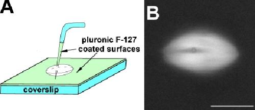 Figure 1. Experimental approach for spindle skewering. (A) The cartoon shows the experimental setup used in all skewering experiments (see Materials and methods for more details). (B) Example of a skewered spindle visualized by the addition of X-rhodamine–labeled tubulin to the extract. The cross section of the microneedle is seen as a dark annulus. Bar, 25 µm.