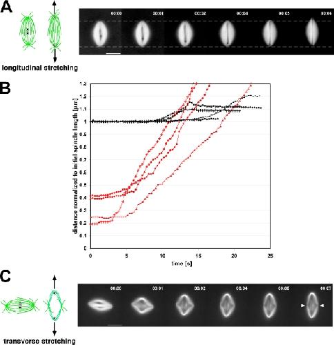 Figure 4. Lateral interactions between microtubules are more robust near the spindle poles. (A and C) The cartoons show the initial positions of the two skewering needle tips within the spindle and the direction of needle movement. (A) The two needles were initially positioned one on each side of the metaphase plate and then spread apart along the interpolar axis. The images show a representative time-lapse series of a spindle being longitudinally stretched. Dashed lines represent the position of the spindle poles before the onset of stretching. (B) Changes in spindle length during longitudinal stretching (normalized to the initial length of the spindle) are plotted versus time, shown as black lines, whereas corresponding plots of needle separation versus time are shown in red. Matching markers indicate data taken from the same experiment. Percentages are the ratio of needle separation at the onset of spindle elongation to the initial spindle length (elongation onset was arbitrarily defined as the time point at which the spindle became 0.5% longer than its initial length). (C) Spindles were also stretched in the orthogonal direction, transverse to their interpolar axes. In these experiments, spindle deformation began at the onset of needle separation and continued until the needles were stopped. White arrowheads indicate the position of the interpolar axis after transverse spindle stretching. Bars, 25 µm.