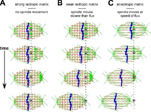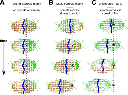 Figure 5. Predicted experimental outcomes of single needle experiments for different types of matrices assuming flux forces can be transmitted to the needle by lateral microtubule cross-links. (A–C) Thin red lines represent the matrix, whereas green lines represent spindle microtubules. Thicker sections along the microtubules depict the movement of a photoactivated mark on the microtubule lattice to illustrate poleward flux over time. The blue shapes within the spindle midzone represent aligned metaphase chromosomes. The dashed line runs through the midpoint of the stationary needle tip, as seen in cross-section (depicted as a white annulus with a filled, black center). See “Does a spindle matrix play a mechanical role in spindle length regulation?” for explanations of each cartoon.