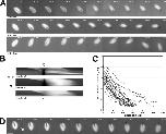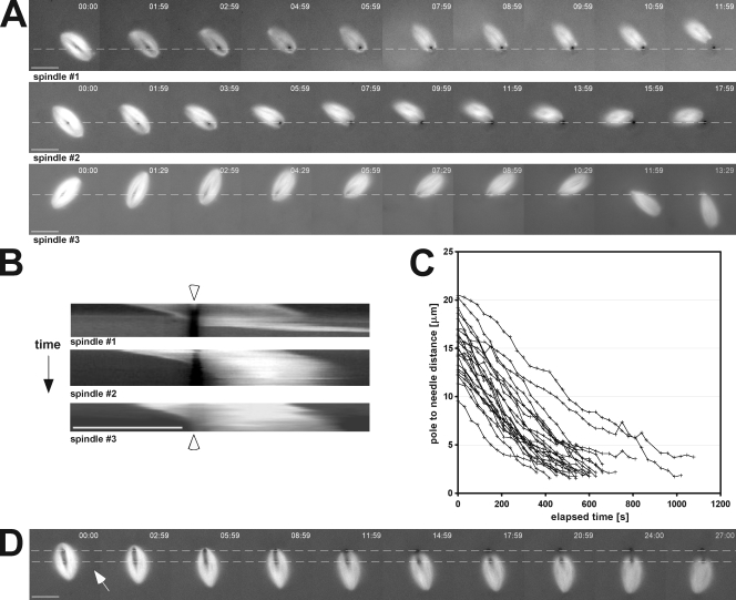 Figure 2. Intrinsic spindle forces move impaling microneedles through the spindle. (A) Images shown were selected from three time-lapse series of skewered spindles. Dashed lines indicate the position of the microneedle, which remained essentially stationary during the experimental time course. (B) Kymographs were used to analyze velocities of spindles as they translocated off microneedles. Because skewered spindles often rotated during time-lapse experiments as the result of changing flows within the extract (e.g., spindle #3), each image in the series was rotated using custom software to maintain a fixed orientation of the spindle’s interpolar axis (arrowheads mark the position of the needle). (C) The distance between the nearest pole and the middle of the needle was plotted versus time. Slopes were calculated using linear regressions from these plots of pole to needle distances of >5 µm and those equal to 5 µm. (D) Two microneedles were used to impale spindles. In each case, the needles were positioned on the same side of the spindle midzone, and the spindle moved off both needles, regardless of the predominant direction of extract flow (indicated by the white arrow). Dashed lines indicate the position of the microneedles used to skewer the spindles. Bars, 25 µm.