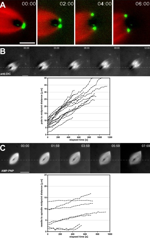 Figure 3. Intrinsic forces push but do not pull the spindle off impaling microneedles. (A) The time-lapse series shows the dynamic morphology of a spindle pole, labeled with Alexa Fluor 488 anti-NuMA antibodies (green), as it is split by a microneedle. Spindles continued to move despite a lack of any detectable microtubules (red) on the distal side of the microneedle. (B) Time-lapse images show the behavior of skewered spindles ∼5–10 min after the addition of function-perturbing antibodies against the 70.1-kD DIC (anti-DIC). The distance between the metaphase plate and the needle were measured and plotted as a function of time for multiple spindles in the corresponding graph. (C) Assembled spindles were treated with 1.5 µM AMP-PNP and skewered within 5–10 min after treatment. AMP-PNP at this concentration inhibited flux, in agreement with nearly horizontal plots of needle to spindle midpoint distance versus time (graph). (B and C) Dashed lines indicate the position of the microneedle used to skewer the spindles. Bars: (A) 5 µm; (B and C) 25 µm.