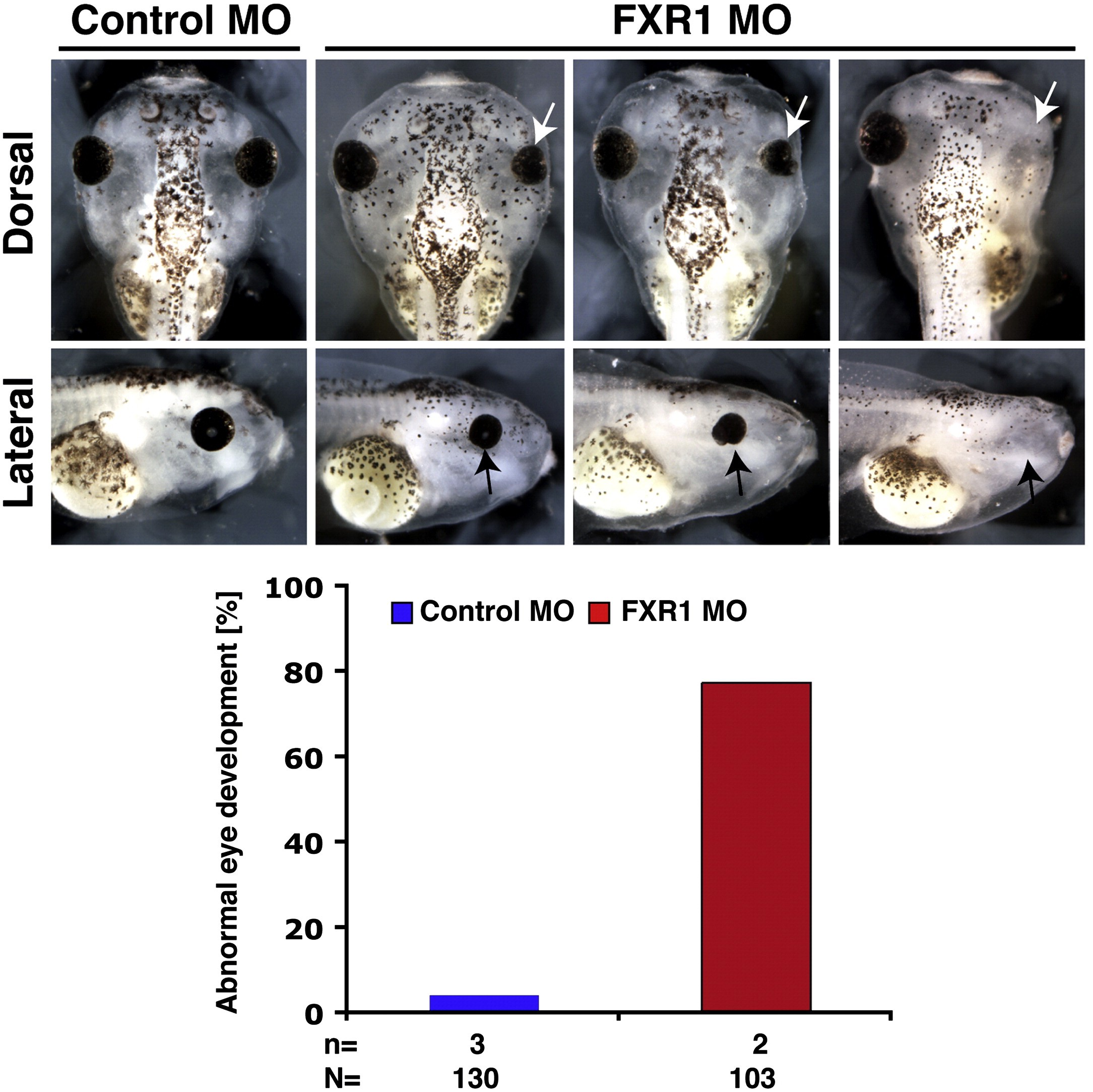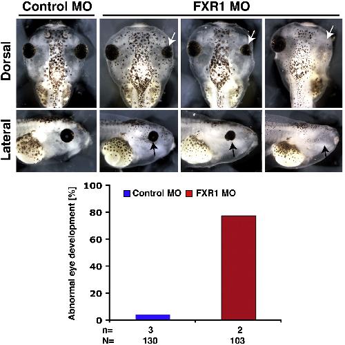 Suppl. Fig. 3. The injection of FXR1 MO led to defects during eye as well as cranial cartilage development (black and white arrowheads). A quantitative presentation is given. n = number of independent experiments; N = number of analyzed embryos. |