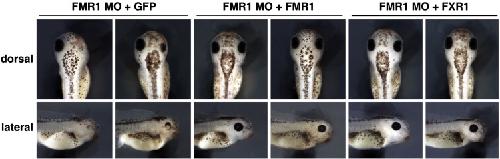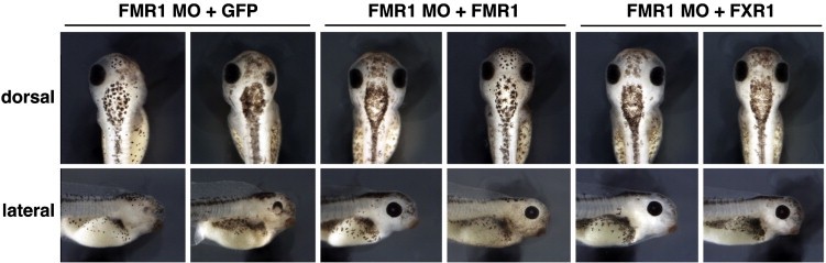Suppl. Fig. 4. The coinjection of FMR1 MO together with δ5′UTR FMR1 or δ5′UTR FXR1 RNA led to a rescue of the FMR1 MO-induced eye phenotype. Two representative embryos for each injection are given. |