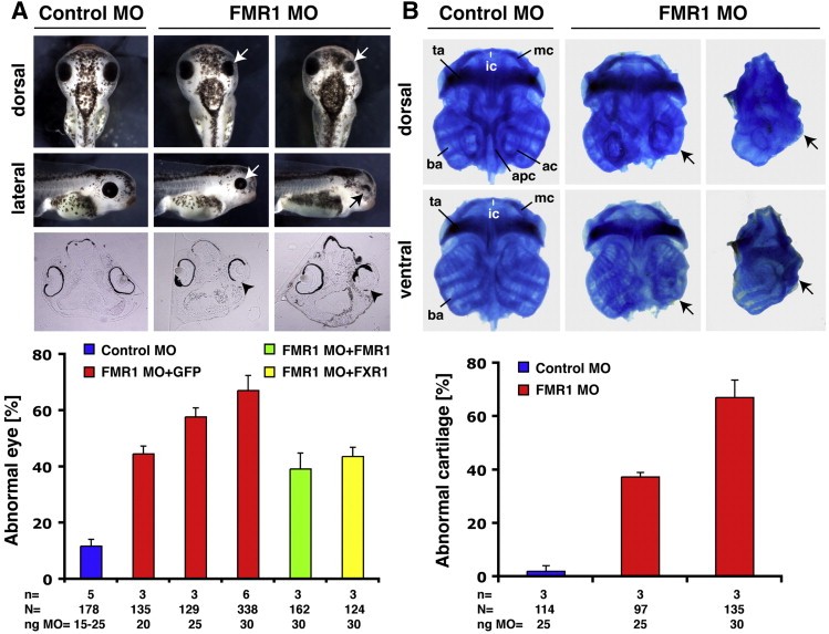 Fig. 1. Downregulation of FMR1 results in defects during eye as well as cranial cartilage development. A. Injection of FMR1 MO led to abnormal eye development (white and black arrows) in a dose-dependent manner as judged by the RPE. Control MO injection did not interfere with eye development. Vibratome sections showed disorganized layers of the retina as well as missing ventral RPE (black arrowheads). The coinjection of FMR1 MO with δ5â²UTR FMR1 or δ5â²UTR FXR1 RNA resulted in a rescue of the eye phenotype, see also Suppl. Fig. 4. B. Downregulation of FMR1 function resulted in reduced cranial cartilage structures on the injected side (arrows) shown by Alcian blue staining. Control MO did not interfere with cartilage development. Quantitative presentations are given. Abbreviations: ac = auditory cap; apc = anterior parachordal cartilage; ba = branchial arches; ic = infrarostral cartilage; mc = Meckels cartilage; n = number of independent experiments; N = number of analyzed embryos; ng = nanogram; ta = tectum anterius. |