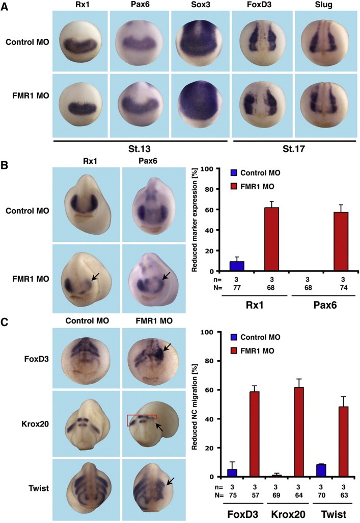 Fig. 2. FMR1 interferes with late eye and NC cell development. A. Injection of FMR1 and Control MO had no effect on the expression of neural marker genes at stages 13 and 17. B. FMR1 deficient embryos showed a reduced expression of eye marker genes Rx1 and Pax6 on the injected side (arrows) at stage 23. A quantitative representation is given. C. Inhibition of FMR1 resulted in defects in NC cell migration at stage 20 (FoxD3 expression, arrow) and stage 23 (expression of Krox20 and Twist, arrows). The red brackets highlight the difference of migrating Krox20-positive NC cells between uninjected and FMR1 MO injected sides. A quantitative presentation is shown. n = number of independent experiments; N = number of analyzed embryos. |