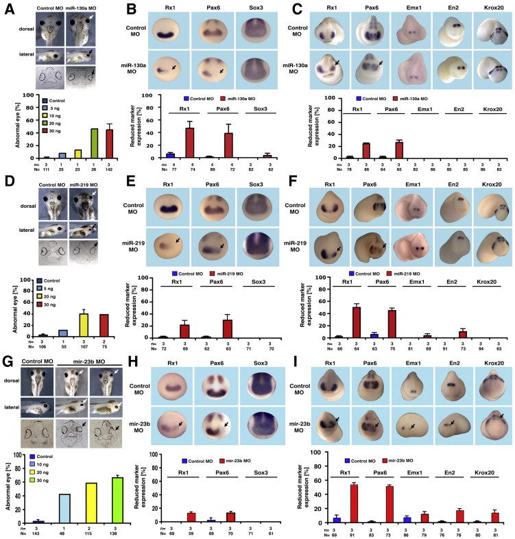 Fig. 5. Phenotype of miR-130a, miR-219 and miR-23b MO injections. A. Injection of miR-130a MO resulted in smaller eyes on the injected side (white and black arrows) in a dose-dependent manner. Histological sections showed that the different layers of the retina were not disturbed (black arrow). Control MO injection did not affect eye development. B. Loss of miR-130a function did not alter the expression of the pan-neural marker gene Sox3 at stage 13, but the expression of Rx1 and Pax6 (back arrows). C. MiR-130a MO injected embryos revealed a downregulation of Rx1 and Pax6 at stage 23 (black arrows), but no chance in the expression of brain marker genes. D. MiR-219 deficient embryos showed smaller eyes (white and black arrows) in contrast to the control embryos (Control MO). E. The injection of 20Â ng miR-219 MO led to a reduced expression of Rx1 and Pax6 (black arrows), but not of Sox3 at stage 13. F. The expression of Rx1 and Pax6 (black arrows) at stage 23 was downregulated upon loss of miR-219, whereas Emx1, En2 and Krox20 were not affected. G. The injection of miR-23b MO resulted in the development of abnormal eyes which are completely deformed (white arrows). In many embryos, the RPE was not closed at the ventral side of the embryo (right panel). The quantitative representation shows that this effect was dose-dependent. H. Expression of Rx1, Pax6 and Sox3 at stage 13. Loss of miR-23b led to a slight reduction in Rx1 and Pax6 expression. Sox3 was not affected. I. MiR-23b deficient embryos showed a strong downregulation of Rx1 and Pax6 and a slight reduction of Emx1, En2 and Krox20 on the injected side at stage 23 (black arrows). For all experiments a quantitative representation is shown. n = number of independent experiments; N = number of analyzed embryos. |