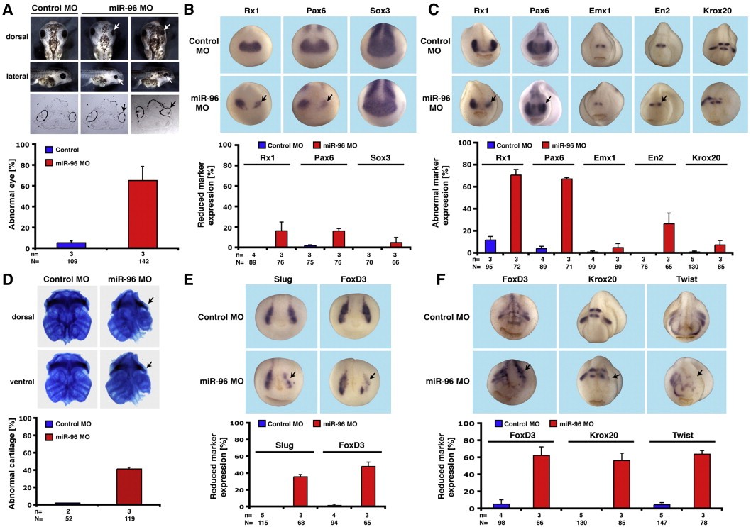 Fig. 7. miR-96 MO phenotype. A. Loss of miR-96 function was accompanied by eye malformations (white arrows). B. Injection of 20Â ng miR-96 MO resulted in a slight downregulation of Rx1 and Pax6 on the injected side at stage 13 (black arrows). C. At stage 23, depletion of miR-96 led to a strong downregulation of Rx1 and Pax6 on the injected side (black arrows). Emx1 and Krox20 were not affected, whereas the expression domain of En2 was broadened in around 27% of the analyzed embryos (black arrow). D. The downregulation of miR-96 was followed by a reduction of the cranial cartilage on the MO-injected side of the embryo (black arrows). The cartilage preparation of the control MO injected embryo is identical to Fig. 6D. E. At stage 17, the expression of Slug and FoxD3 was disturbed after loss of miR-96 function (black arrows). E. At stage 20, FoxD3 expression was downregulated on the injected side. At stage 23, Krox20 and Twist were reduced after the injection of 20Â ng miR-96 MO (black arrows). For all shown experiments, quantitative representations are given. n = number of independent experiments; N = number of analyzed embryos. |