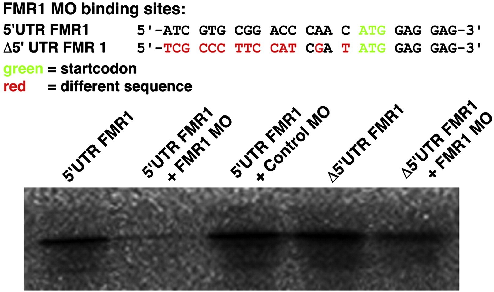 Suppl. Fig. 2. FMR1 MO binding sites. FMR1 MO specifically inhibits the translation of FMR1 mRNA as shown by a coupled invitro transcription and translation reaction (Promega). In contrast the translation of the δ5â²UTR FMR1 construct is not inhibited by the FMR1 MO. |