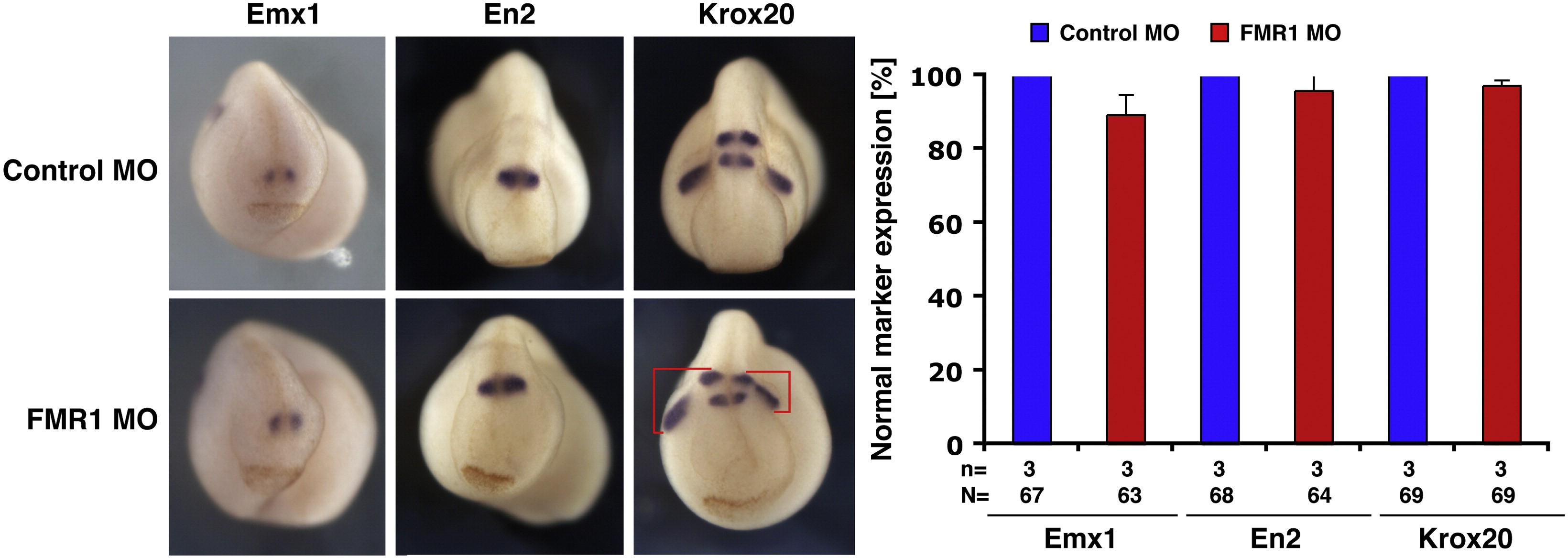 Suppl. Fig. 5. The downregulation of FMR1 had no effect on the expression of brain-specific marker genes. The FMR1 MO injected sides are at the right. FMR1-depletion affects the migration of Krox20-positive NC cells (red brackets) but not staining of Krox20 in the hindbrain. A quantitative presentation is given. n = number of independent experiments; N = number of analyzed embryos. |