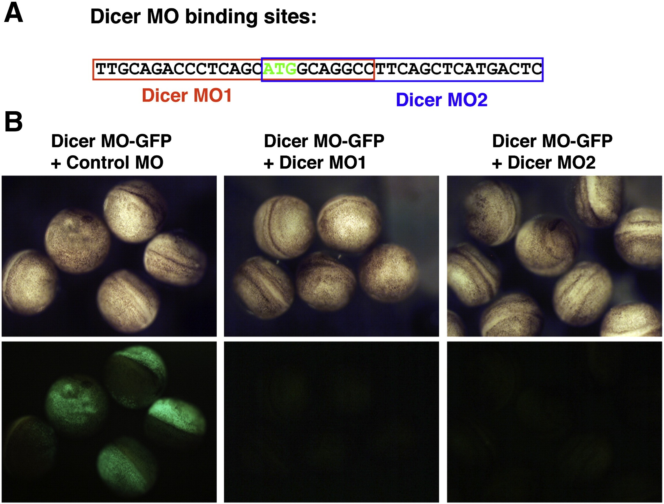 Suppl. Fig. 7. Dicer MO 1 and MO2 binding sites. Both MOs are able to block the translation of a Dicer-GFP fusion construct in-vivo. |