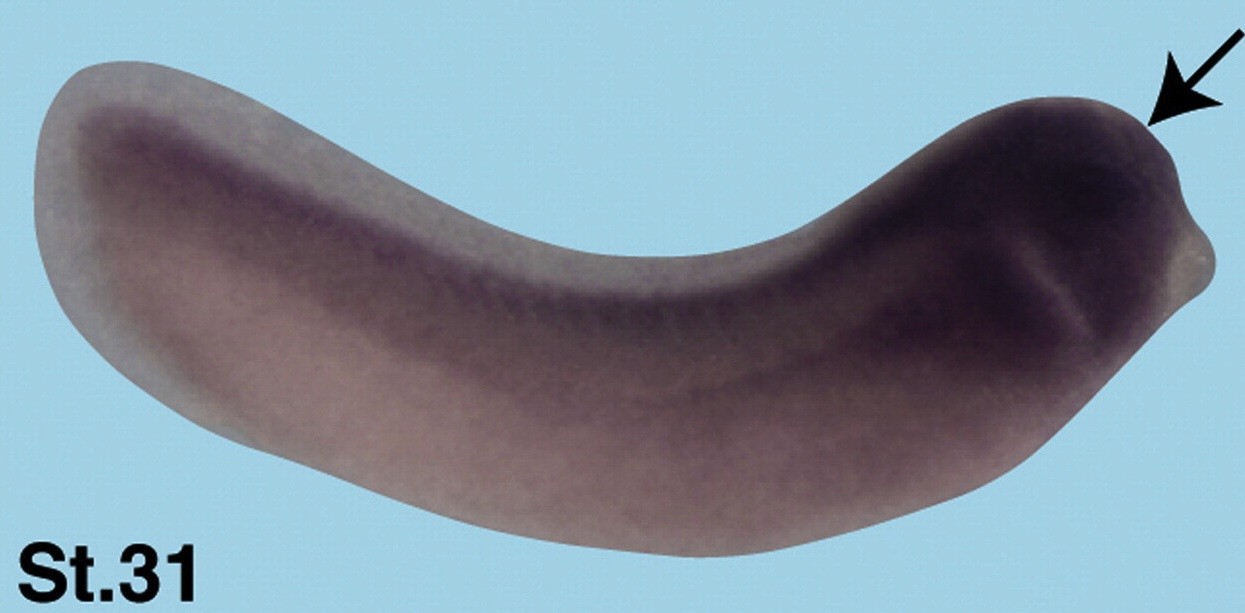 dicer1 (dicer 1, ribonuclease type III ) gene expression in Xenopus laevis/ embryo, via in situ hybridization, NF stage 31, anterior right, lateral view, dorsal up. |