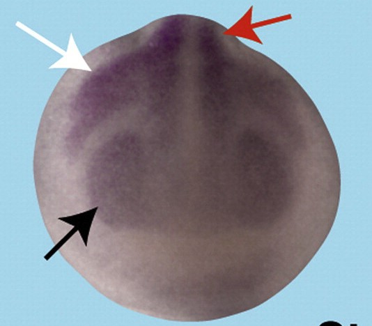 fmr1 (fragile X mental retardation 1) gene expression in Xenopus laevis embryo via in situ hybridization, NF stage 15, anterior view, dorsal up. |