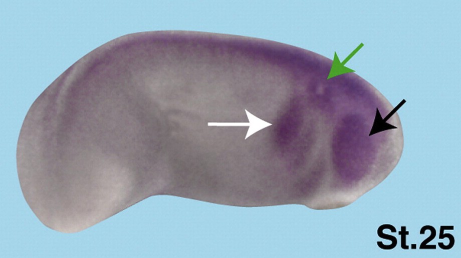 fxr1 (FMR1 autosomal homolog 1) gene expression in Xenopus laevis embryo via in situ hybridization, NF stage 25, lateral view, anterior right, dorsal up. |