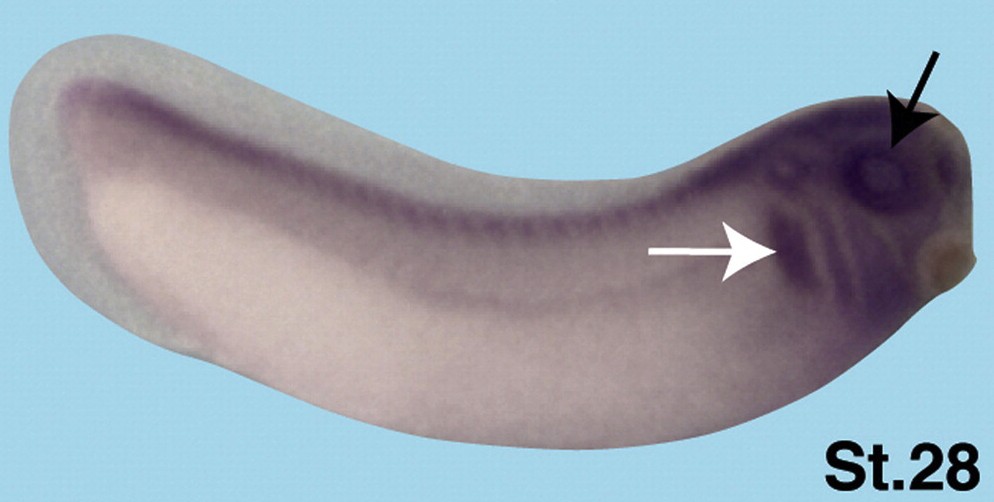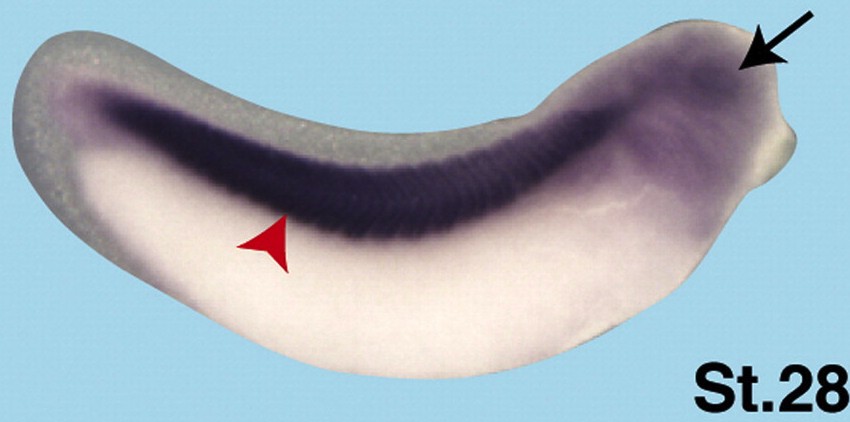 fxr1 (FMR1 autosomal homolog 1) gene expression in Xenopus laevis embryo via in situ hybridization, NF stage 28, lateral view, anterior right, dorsal up. |