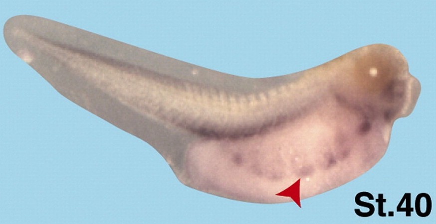 fxr1 (FMR1 autosomal homolog 1) gene expression in Xenopus laevis embryo via in situ hybridization, NF stage 40, lateral view, anterior right, dorsal up. |