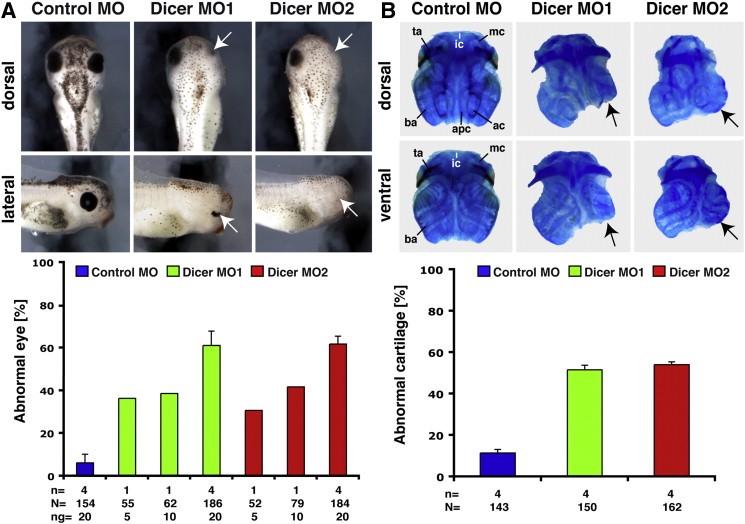Fig. 3. Loss of Dicer function leads to eye and cartilage malformations. A. Dicer deficient embryos showed defects in eye development (white arrows) in a dose-dependent manner. Injection of 20 ng Control MO had no effect on eye development. A quantitative presentation is given. B. Injection of 20 ng Dicer MO1 or MO2 resulted in abnormal cranial cartilage structures on the injected side (black arrows). Control MO injection did not influence cartilage development. A quantitative evaluation is given. Abbreviations: ac = auditory cap; apc = anterior parachordal cartilage; ba = branchial arches; ic = infrarostral cartilage; mc = Meckels cartilage; n = number of independent experiments; N = number of analyzed embryos; ng = nanogram; ta = tectum anterius. |