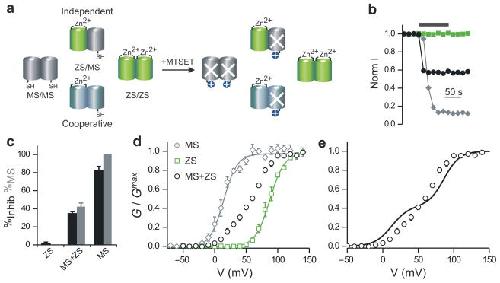 Figure 3. Cooperative gating in Hv1 dimers made of MS and ZS subunits. (a) Assembly of MTSET-sensitive (MS) and Zinc-sensitive (ZS) subunits in homo-and heterodimers. White X indicates blocked MS subunit after MTSET treatment. (b) Example of changes in normalized proton currents from membrane patches of oocytes expressing Hv1 MS (gray diamonds), Hv1 ZS (green squares), or co-expressing Hv1 MS with ZS (black circles). 25 μM Zn2+ was maintained in the extracellular solution throughout the recordings. pHi = pHo = 6.0. Black bar indicates duration of exposure to 1 mM intracellular MTSET. The RNA ratio for the co-expression of MS and ZS subunits was 3:1. (c) Quantification of inhibition produced by MTSET for the indicated conditions (black bars). From the extent of proton current inhibition the percentage of MS subunits was calculated (gray bars), as explained in the text. (d) Voltage dependence of proton conductance of Hv1 MS and Hv1 ZS, compared to the voltage dependence of the co-injection of Hv1 MS + Hv1 ZS. See Table 1 for Boltzmann fits. Each point is the average of 4–6 measurements ± s.e.m. Recording conditions and RNA ratio were the same as for panels b and c. (e) Comparison between voltage dependence of proton channels produced by co-expression of MS and ZS subunits (open circles), and voltage dependence expected in case of independent opening of the two pores (continuous line, see text).