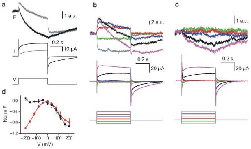 Figure 5. Hv1 voltage-sensor coupling detected by voltage-clamp fluorometry. (a) Voltage sensor movement detected on Hv1 195C labeled with TAMRA-MTS. Changes in fluorescence (F) and proton current (I) were produced by the indicated voltage step (V) from −80 mV to +160 mV. Traces in gray were recorded at pHo 7.4. Traces in black were recorded from the same oocyte in acetate buffer at pHo 6.3, which also acidifies the internal solution (see text). (b–c) Comparison between voltage sensor movement in labeled 195C/195C homodimers and 195C/218S heterodimers. Heterodimers were produced by co-expressing the Hv1 195C subunit with an excess of the 218S subunit. Fluorescence changes and proton currents were elicited by voltage steps from −200 to +200 mV in 80 mV increments. Holding potential was −80 mV, pHo was 6.3. (d) Normalized F-Vs from labeled oocytes expressing the Hv1 195C subunit (red circles) or co-expressing the 195C and 218S subunits (black squares). Fluorescence was measured at the end of the 500-ms long test-pulse (voltage protocol and recording conditions as in b–c. Each point is the average of 5 measurements ± s.e.m.