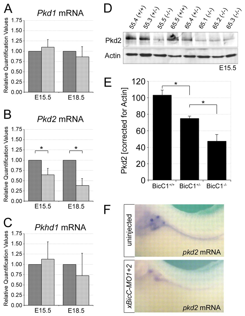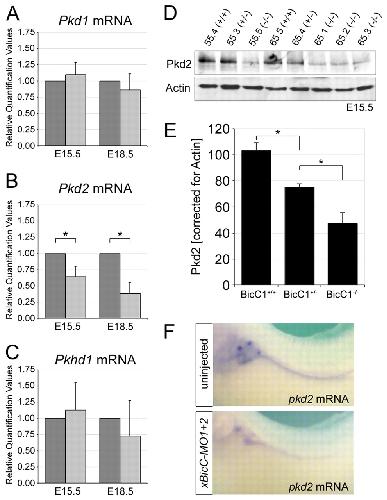 Fig. 3. Bicc1 regulates Pkd2. (A-C) qPCR analysis for mouse Pkd1, Pkd2 and Pkhd1 mRNA levels in Bicc1+/+ (dark gray) and Bicc1â/â (light gray) littermates. The averages and s.d. from six kidney pairs at E15.5 and four pairs at E18.5 are shown (*, P<0.05, Student's t-test). (D) Western blot analysis comparing Pkd2 protein levels in E15.5 kidneys from two Bicc1 mouse litters (#55 and #65) of the indicated genotypes using the Pkd2-specific antibody from Santa Cruz. Actin served as a loading control. (E) Quantification of multiple Pkd2 western blot analyses comparing several mouse litters at E15.5 and normalized to actin. Average values and s.d. are indicated (*, P<0.05, Student's t-test). (F) Whole-mount in situ hybridization for Pkd2 mRNA on uninjected and xBicC-MO1+2-injected Xenopus embryos at stage 39.