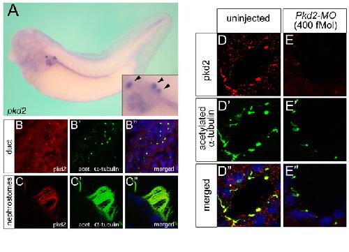 Fig. S5. pkd2 mRNA and protein expression in Xenopus. (A) Whole-mount in situ hybridization detecting expression of pkd2 mRNA in the Xenopus pronephros. Inset is a magnified image of the pronephric tubules and the nephrostomes (arrowheads). (B-C′′) Immunofluorescence using antibodies against Pkd2 (AB9088, Millipore; red) and acetylated α-tubulin (green). Note that Pkd2 is expressed in the cilia of the duct (B-B′′) and those of the multiciliated cells in the nephrostomes (C-C′′) present in the Xenopus pronephros. (D-E′′) Immunofluorescence analysis of the cilia in the pronephric tubules using antibodies against Pkd2 (red) and acetylated α-tubulin (green) comparing uninjected Xenopus embryos with embryos injected with Pkd2-MO (400 fmol) at stage 40. Nuclei were counterstained with DAPI.