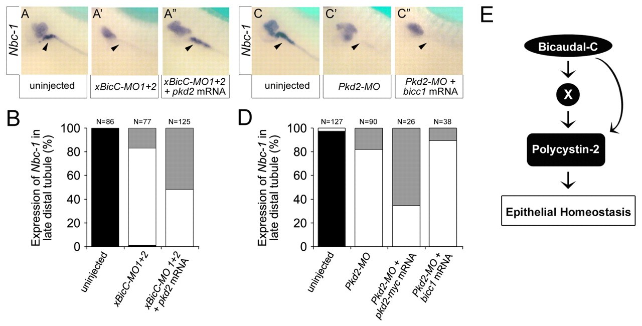 Fig. 4. Bicc1 is epistatic to Pkd2. (A-Aâ²) Analysis of the expression of nbc-1 in the Xenopus late distal tubule at stage 39 by whole-mount in situ hybridization of uninjected control embryos, and embryos radially injected with xBicC-MO1+2 in the presence or absence of a single injection of 2 ng pkd2 mRNA. (B) Quantification of the expression of nbc-1 in the late distal tubule from the experiments shown in A-Aâ². Black, bilateral expression; white, no expression; gray, unilateral expression rescued by co-injected mRNA. The number of embryos analyzed is indicated. (C-D) Reciprocal experiments to those in A-B using Xenopus embryos injected with either Pkd2-MO alone or together with pkd2-myc or bicc1 mRNA. Co-injection with pkd2-myc rescued nbc-1 expression, whereas co-injection with bicc1 did not. (E) Flow diagram outlining the proposed mechanism of Bicc1 activity.
