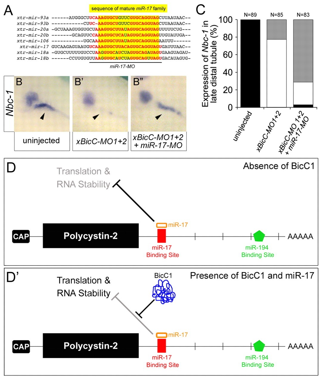 Fig. 7. Cross-talk between Bicc1 and the miR-17 miRNA family. (A) Alignment of the Xenopus miR-17 family members. Mature forms are highlighted in yellow. The sequence targeted by the miR-17 antisense MO (miR-17-MO) is indicated by the black line. The nucleotides shared between miR-17-MO and the individual members are indicated in red. (B-Bâ²) Analysis of the expression of nbc-1 by whole-mount in situ hybridization of uninjected control embryos, embryos injected with xBicC-MO1+2 alone or with miR-17-MO. Arrowheads indicate the expression of nbc-1 in the Xenopus late distal tubule. Note that this expression domain is rescued upon co-injection of the two antisense MOs. (C) Quantification of the experiments shown in B-Bâ². Black, bilateral expression; white, reduced or no expression; gray, unilateral, rescued expression in the late distal tubule. (D,Dâ²) Models for the post-transcriptional regulation of Pkd2 mRNA by the miR-17 family in the absence or presence of Bicc1.