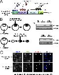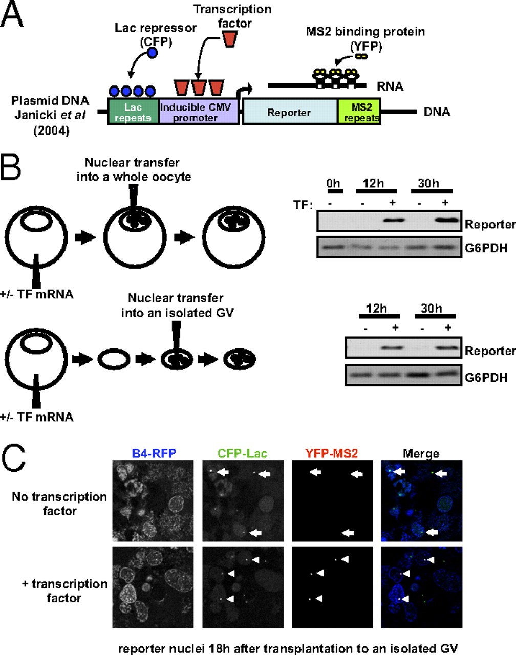 Fig. 2. Real-time monitoring of gene activation in nuclei transplanted to isolated Xenopus oocyte GVs. (A) The diagram shows an inducible CMV promoter (24) flanked by lacR binding site repeats thereby allowing visualization of the reporter gene in cells (by binding of CFP-LacR chimeric protein). The promoter drives the expression of a reporter mRNA containing MS2 binding site repeats, so that the transcribed mRNA at the transcription site can be visualized using a MS2-YFP chimeric protein. Nuclei containing this reporter gene for real-time imaging of transcription (24) were used for transplantation into isolated GVs. (B) Genes are reactivated in nuclei transplanted into a GV that already has been isolated from a Xenopus oocyte. Nuclei containing a reporter gene (diagram in A) were transplanted into the GV of a whole oocyte or into an isolated GV. Transplantation was carried out into GVs expressing or not expressing a transcription factor (TF) that is required to activate the reporter gene. RT-PCR analysis shows transcription factor-dependent activation of the reporter gene from both sets of transplanted nuclei. (C) Expression of the B4-RFP protein in the GV allows visualization of transplanted nuclei (Fig. 3), whereas expression of CFP-LacR shows the position of the reporter genes in these nuclei (dots in CFP-Lac channel). The MS2-YFP protein also expressed in the GV shows newly synthesized mRNA at the gene loci, but only when the GV contains the transcription factor specific to the reporter gene (Compare arrows in Upper with arrowheads on Lower Merge image).