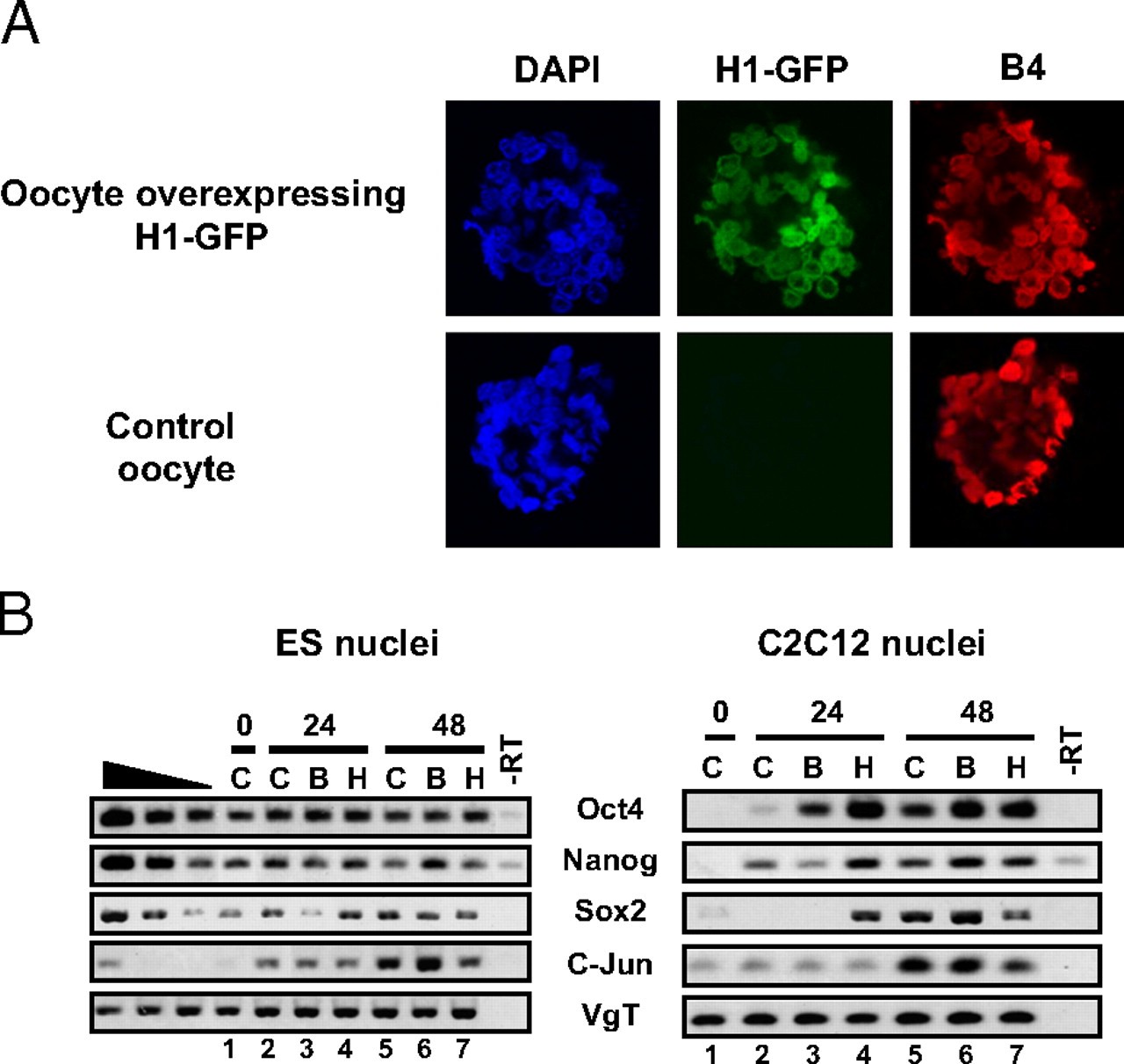 Fig. 5. Loss of somatic H1 from transplanted nuclei is not required for gene reactivation. (A) H1 overexpression in the oocyte maintains H1 presence in transplanted nuclei but does not inhibit B4 incorporation. C2C12 nuclei were transplanted into control or H1-GFP-expressing oocytes. B4-RFP was detected by immunolabeling 24 h after NT. Loss of H1 from transplanted nuclei (Fig. 3A) can be prevented by expressing H1-GFP in the oocyte before NT (Upper Row, Center). B4 is loaded onto chromatin (Right), whereas H1-GFP is maintained (Upper Row, Center) or not (Bottom Row, Center). (B) Pluripotency genes are reactivated even when H1 is maintained in transplanted ES or C2C12 nuclei. RT-PCR analysis was carried out under conditions depicted in A. Pluripotency genes are reactivated whether H1 is maintained or not in transplanted nuclei (compare columns 5 and 7). Data are from three experiments. B, oocyte injected with B4 mRNA; C, control oocyte; H, oocyte injected with H1 mRNA.