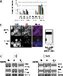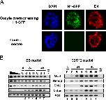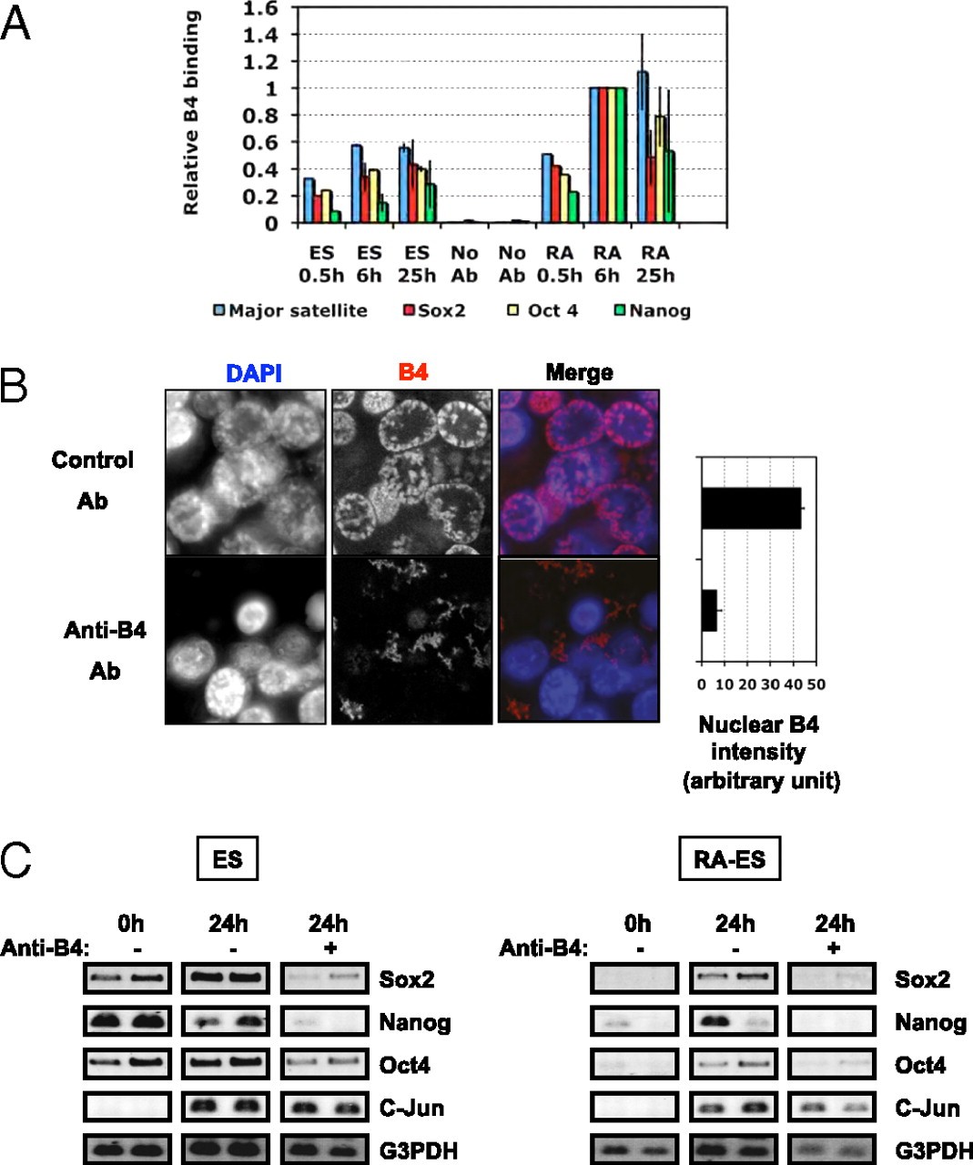 Fig. 7. Incorporation of B4 into transplanted nuclei is necessary for pluripotency gene expression in oocytes. (A) ChIP analysis of B4 binding to pluripotency genes in transplanted nuclei. B4 binding to pluripotency gene promoters and to the major satellite region of ES or RA-ES nuclei was analyzed by ChIP 0.5 h, 6 h, and 25 h following transplantation. Error bars represent mean ± SEM. Data are from two experiments. No Ab, control chip performed in the absence of antibody. (B) Incorporation of B4 in transplanted nuclei (control Ab) can be prevented by injection of anti-B4 antibody into the oocyte GV (Lower Row, Center). C2C12 nuclei were transplanted with or without anti-B4 antibody into oocytes expressing B4-GFP. Then B4-GFP labeling of transplanted nuclei was detected by confocal microscopy. The graph on the right shows quantification of the B4-GFP signal. Error bars indicate mean ± SEM (n = 15 nuclei). (C) Pluripotency gene reactivation requires incorporation of B4 into transplanted nuclei. RT-PCR analysis was carried out in conditions depicted in B. Gene reactivation is inhibited in anti-B4 samples at 24 h in both ES and RA-ES transplanted nuclei. Data are from three experiments.