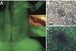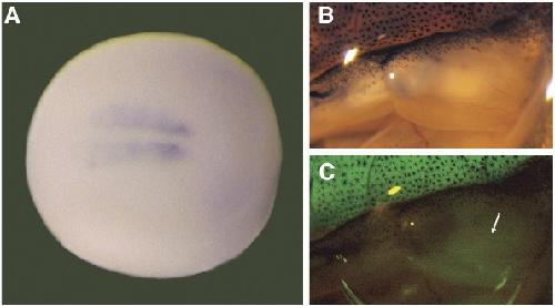 Fig. 7 . Onset of XMRF4a transgene expression. (A) In situ hybridization showing GFP expression under control of the 610-bp promoter in the early somites of an F1 individual at stage 18-20, dorsal view, anterior to the right. (B) Reflected-light image of the righthindlimb of a stage-56 F1 animal carrying the 1.1-kb promoter construct. (C) GFP fluorescence from the same limb as in (B). Note that the developing muscle (arrow) in the limb shows much lower intensity of fluorescence than do the tailmyotomes at the top of the figure.