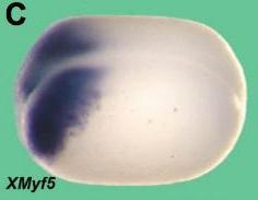 presomitic mesoderm prior to segmentation, as well as in the anterior. (B) Stage 20 neurula, lateral view. XMRF4 staining is most intense in the somites but also evident in the eyeprimordia. (C) Stage 16 neurula, dorsolateral view. XMyf5 expression is confined to the posteriormesoderm.