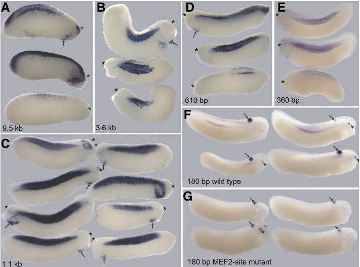 Fig. 4. Relative activity of XMRF4a promoters in transgenic X. laevis embryos. Lengths of the promoters (described in the text) are indicated. Each panel shows lateral views of representative positive individuals from a single experiment. All specimens are oriented with dorsal sides towards the top of the figure, but because expression often was asymmetric, either the left or right side may be shown, whichever had more intense staining, and the anterior end is marked with an asterisk. In panels (A), arrows indicate ectopic expression in cardiogenic regions. Embryos in (F,G) are co-transgenic for both the indicated XMRF4a-GFP construct and the gamma-crystallin-GFP construct; all are oriented with the anterior to the right side of the figure. Staining of the hindbrain (arrows) and, in some cases, the lens of the eye (arrowheads), results from gamma-crystallin-GFP expression.