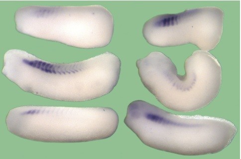 Fig. 5. Activity of the rat MRF4 minimal promoter in transgenic X. laevis embryos. In situ hybridization shows GFP expression in representative positive individuals, oriented with dorsal side towards the top of the figure, anterior towards the left.